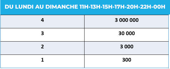 • Le joueur peut prendre des tickets jusqu’à 1 minutes avant l’heure du tirage ; les ventes pour un tirage seront automatiquement clôturées 1 minutes avant ledit tirage. Cependant, les ventes continueront pour le compte des autres tirages à venir dans la journée ou du lendemain. Le délai de 1 minutes avant l’heure du tirage pourra éventuellement être réduit à 30 secondes. Dans tous les cas, les ventes sont automatiquement arrêtées à l’heure du tirage.